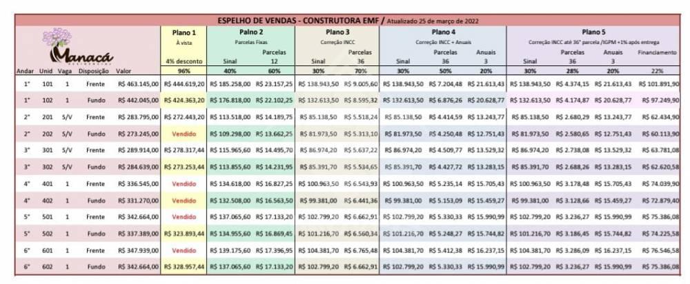 - Plano 05: Correção INCC até 36 parcela / IGPM + 1% após entrega ( sinal 30%, 28% em 36 parcelas, 20% em 3 Anuais e 22% financiamento).