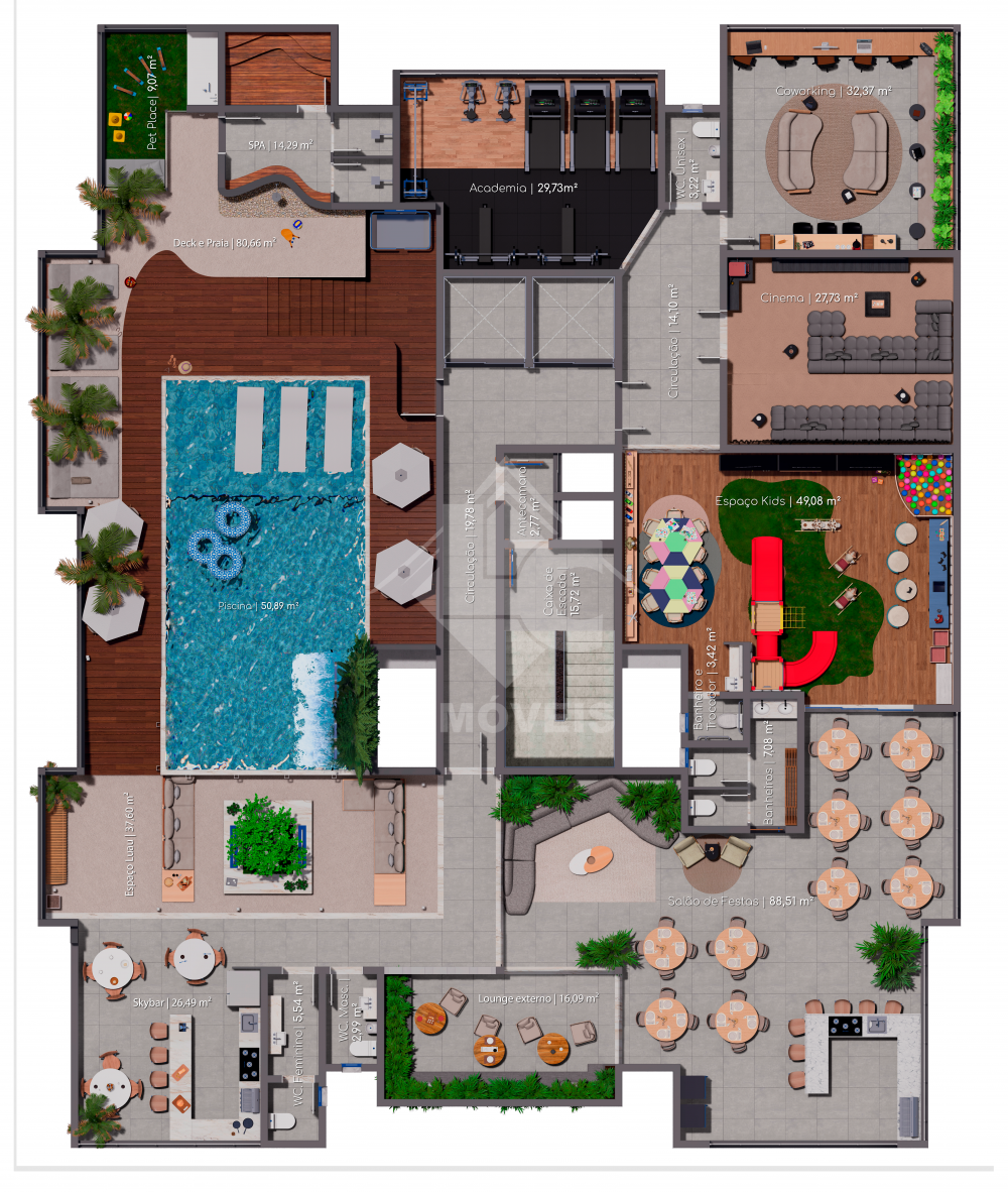 No rooftop, um verdadeiro oásis: piscina exclusiva, Sky Bar, Espaço Lual e Salão de Festas para momentos inesquecíveis.No dia a dia, academia moderna, spa, coworking, cinema, petplace e playground tornam a rotina mais prática e prazerosa.