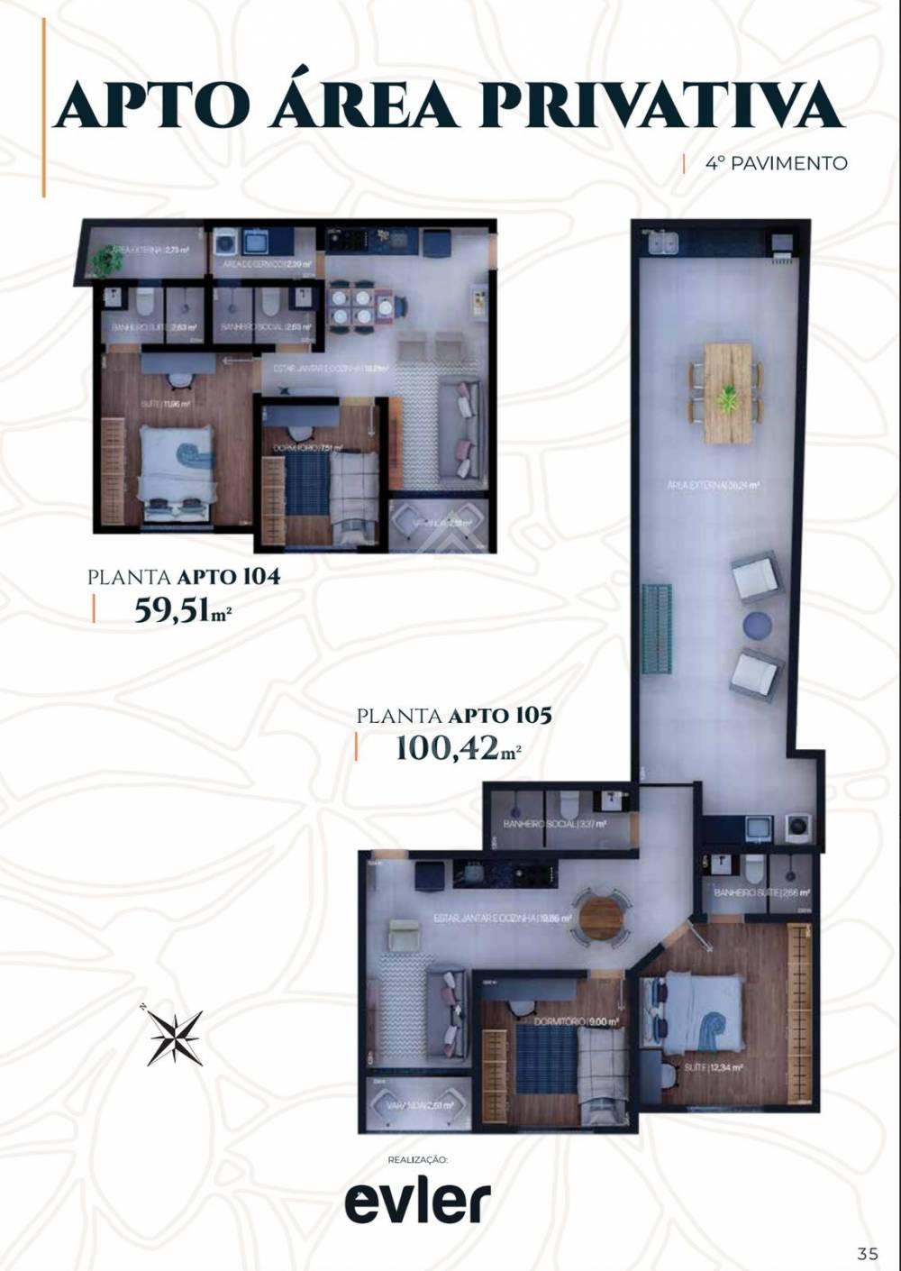 Apartamentos de  02 quartos, sendo 01 suíte, sala, cozinha, banheiro social e área de serviços.