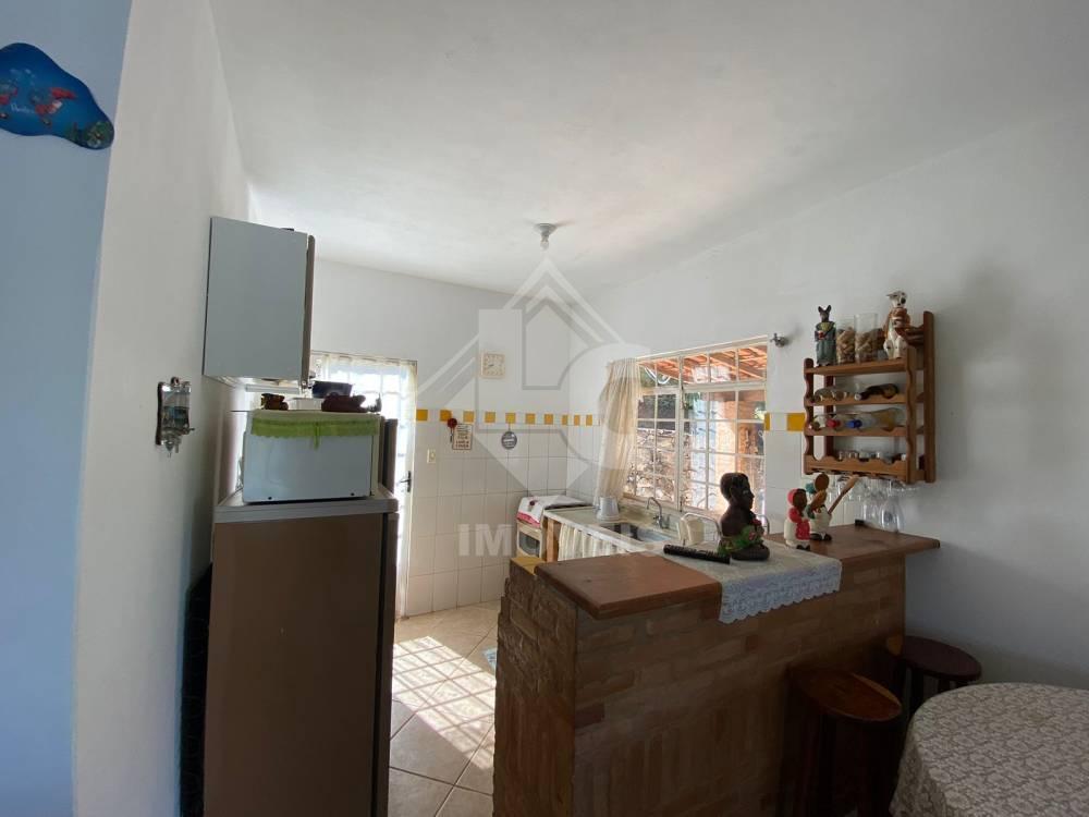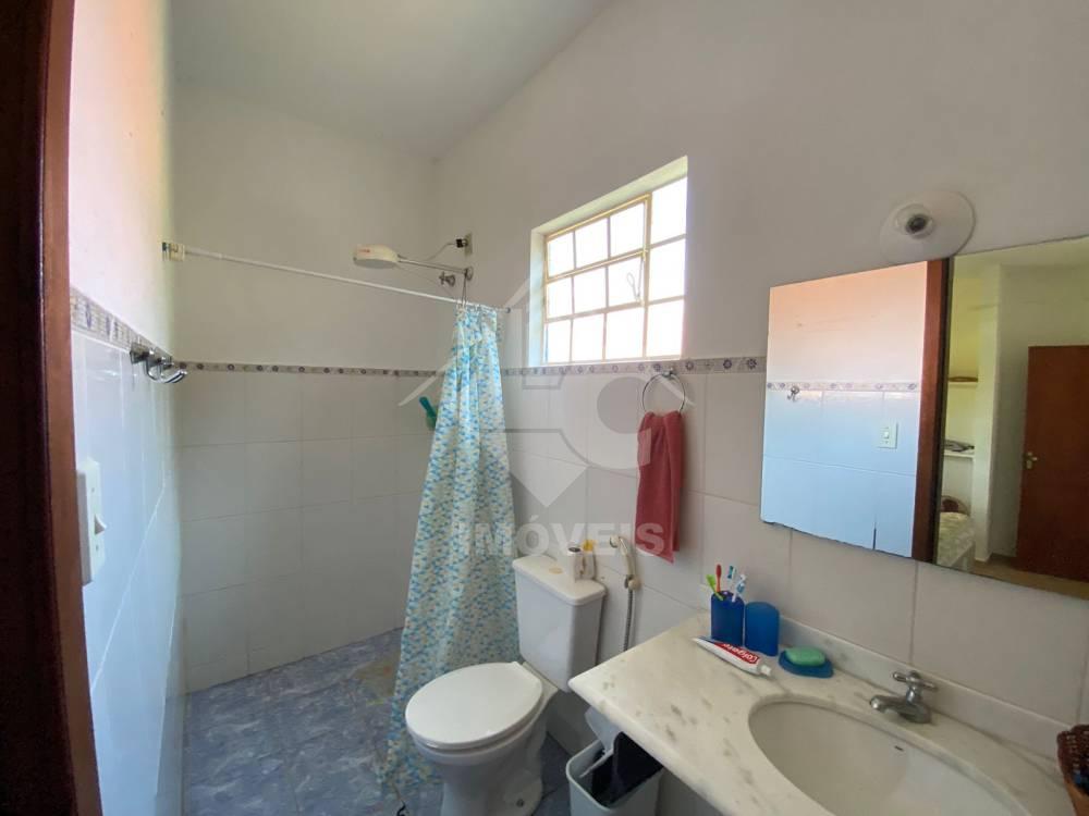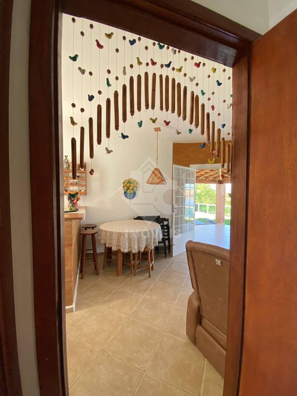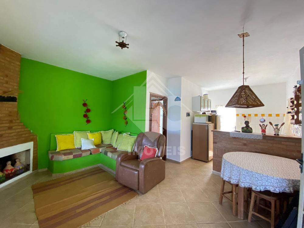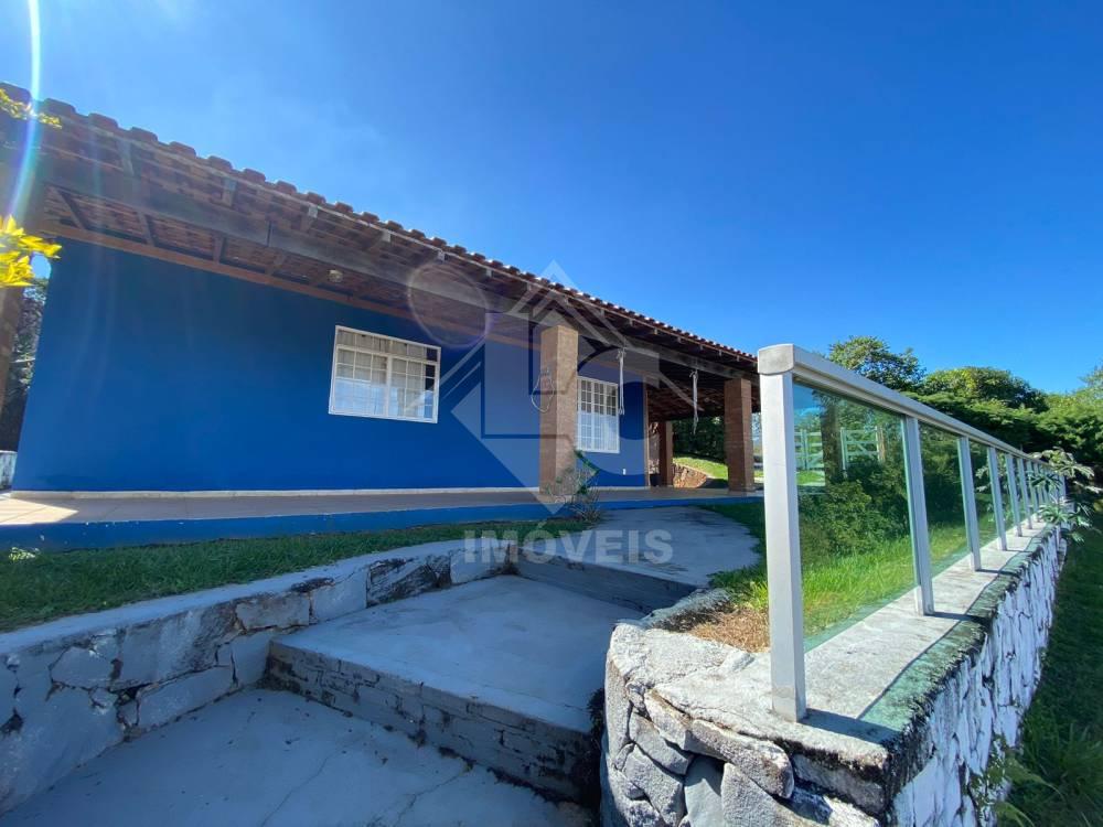 Casa com 3 quartos, sendo um suíte, sala com lareira, cozinha conjugada à sala, banheiro social, varanda, área gourmet com churrasqueira, fogão à lenha, pia, sáuna, banheiro.