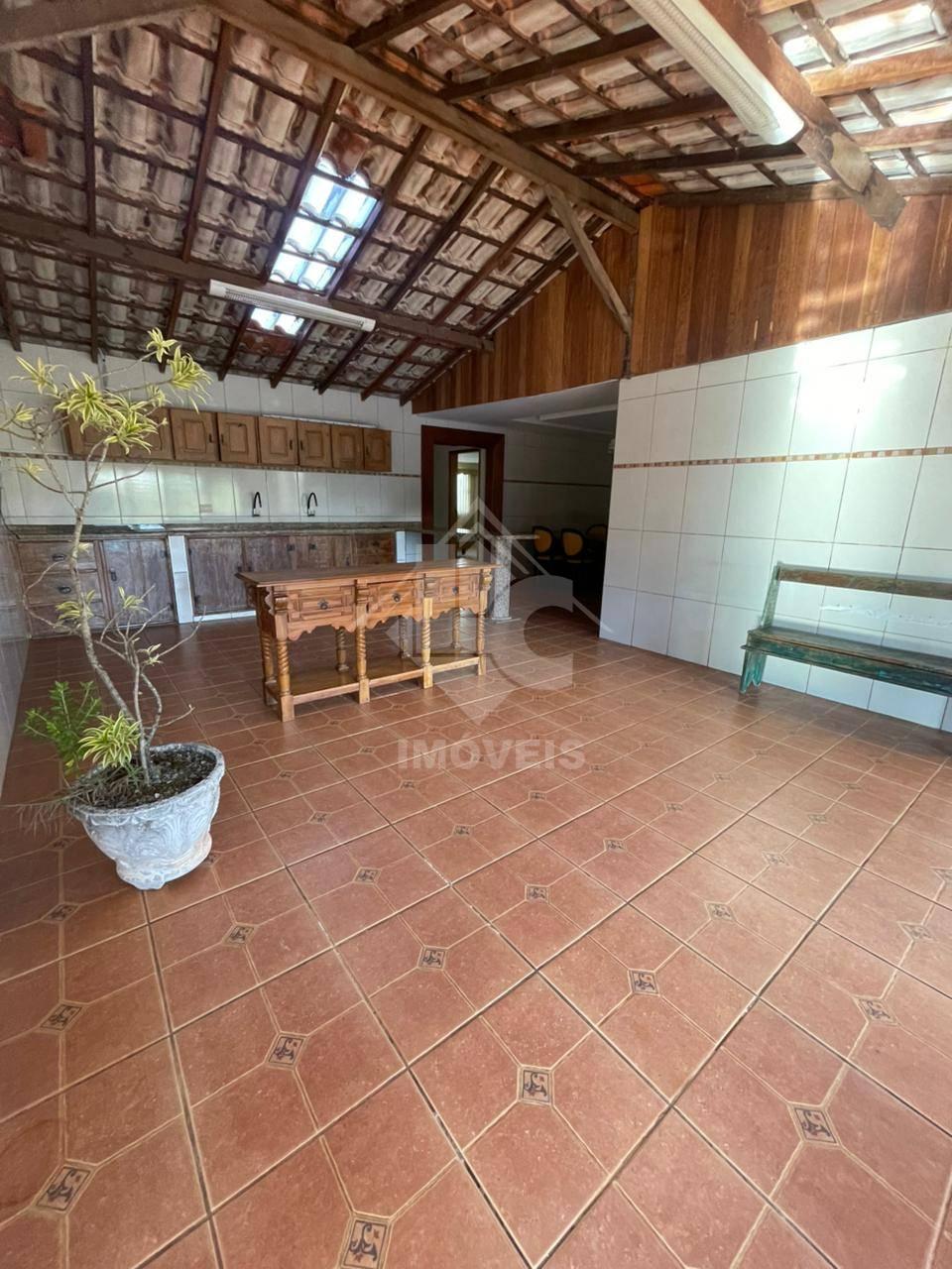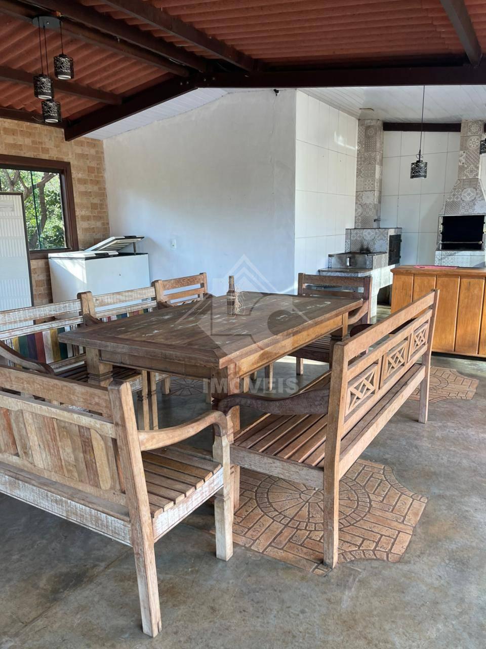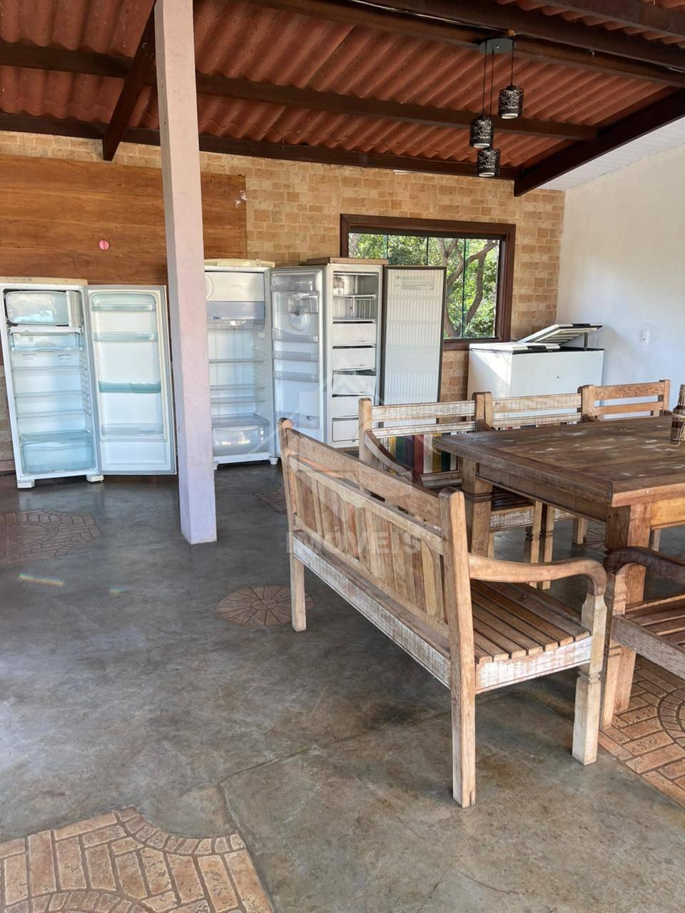 Na área externa com churrasqueira, fogão á gaz, fogão à lenha, filtro de barro, 02 FREEZERES (um horizontal com 02 tampas e outro vertical), uma geladeira, uma mesa de madeira, 08 bancos de madeira e um rack de madeira.