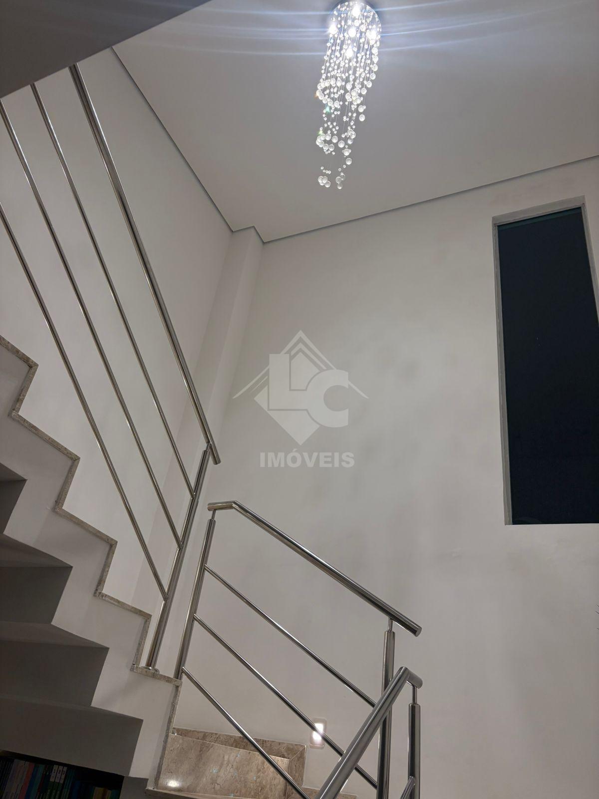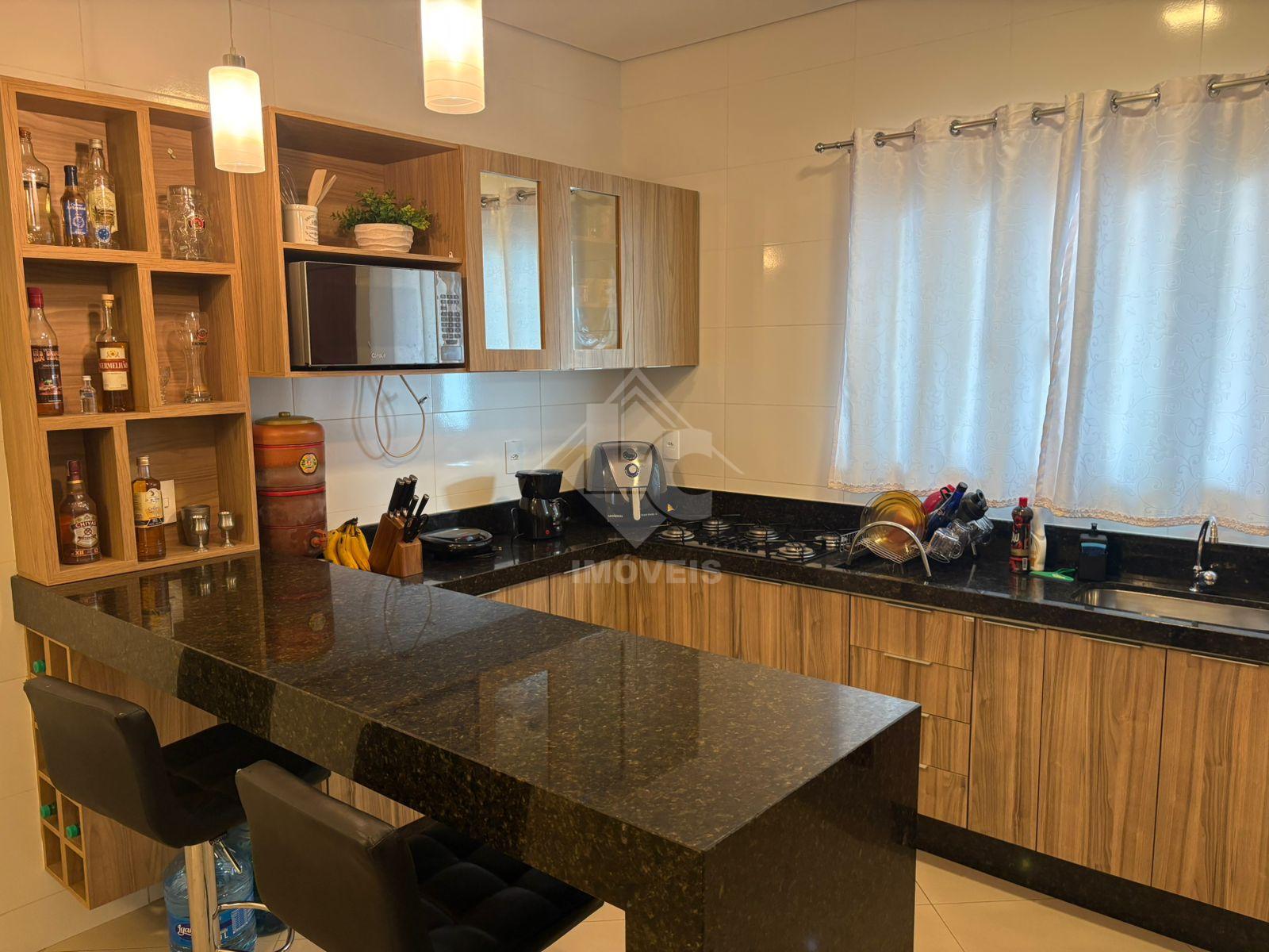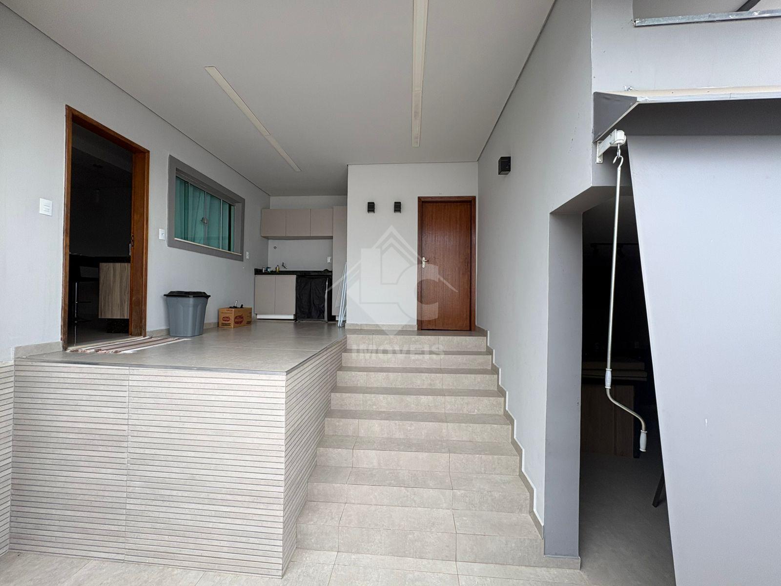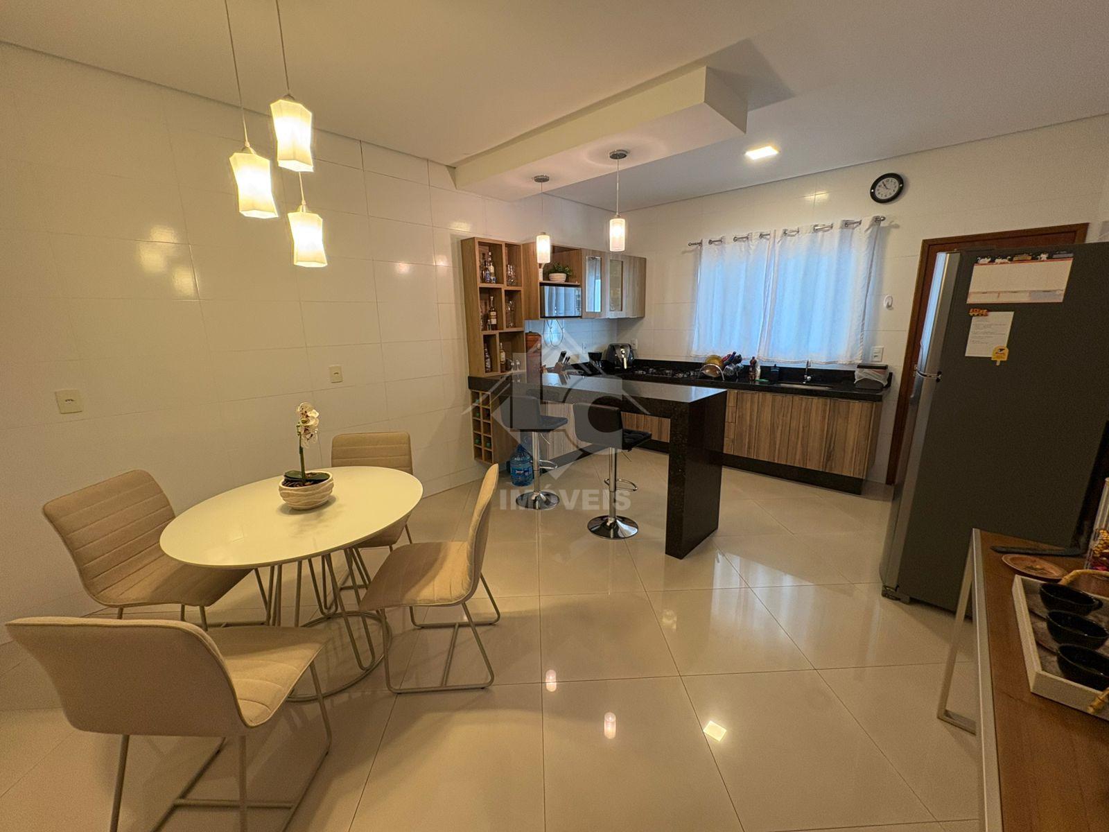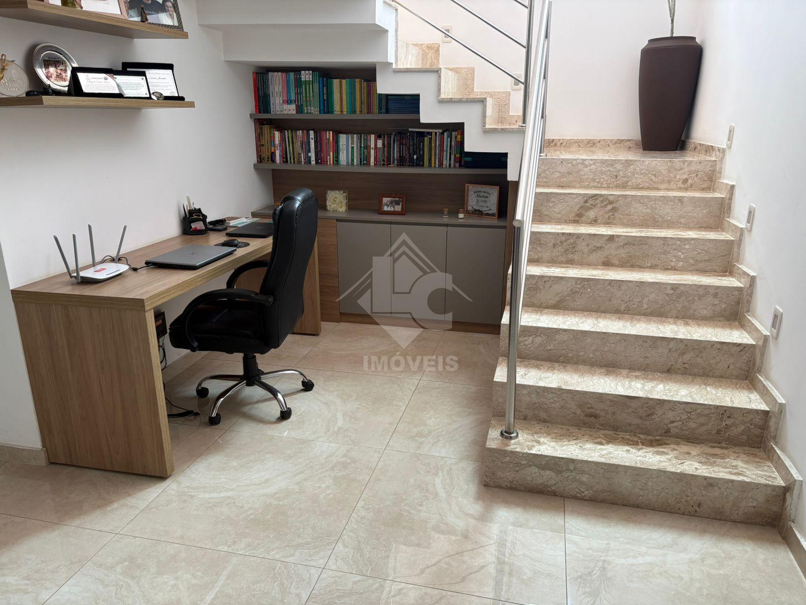 São 3 quartos, sendo duas suítes, uma no primeiro andar e uma no segundo, sala, cozinha, banheiro social, cozinha planejada, escritório planejado, lavanderia planejada e garagem para 3 carros e motos, sendo dois carros independentes.