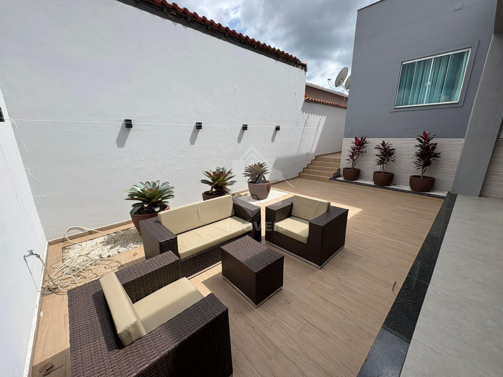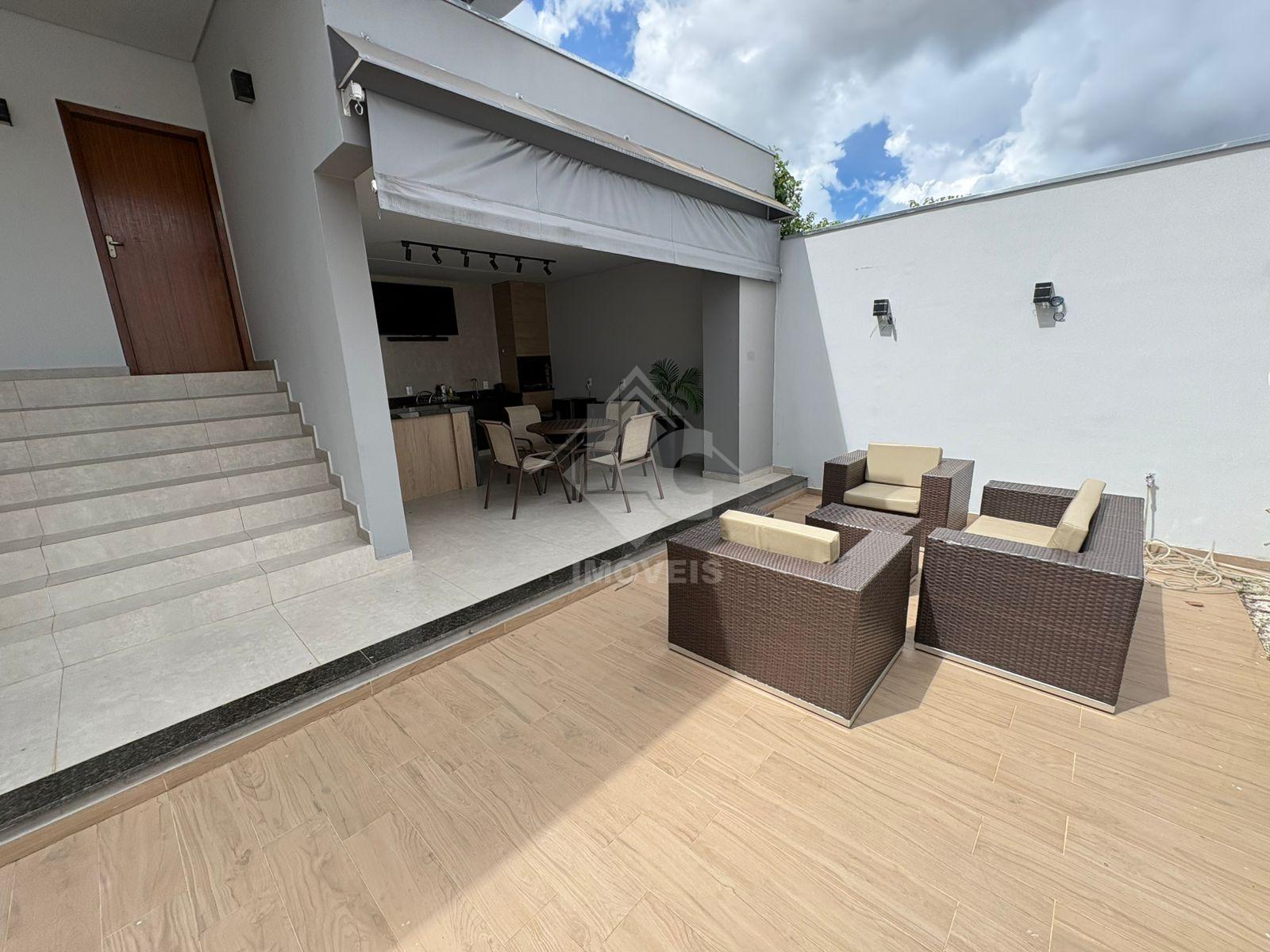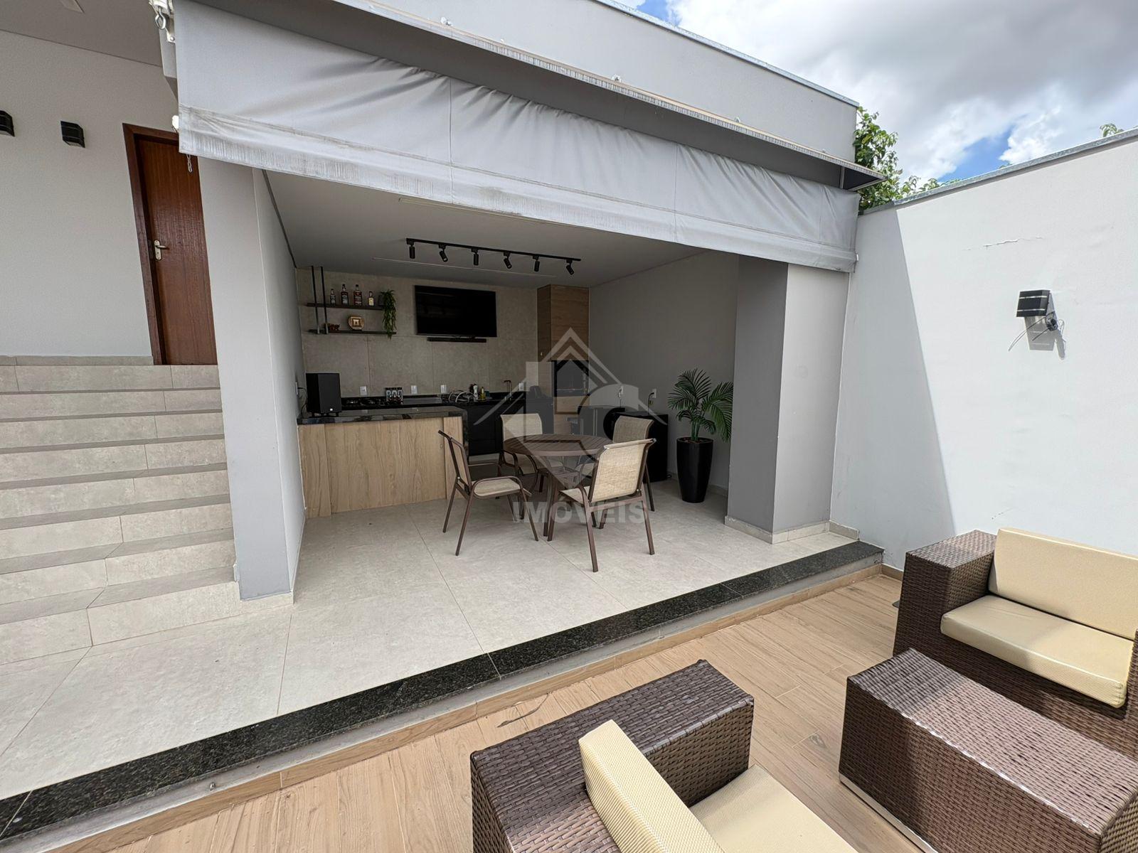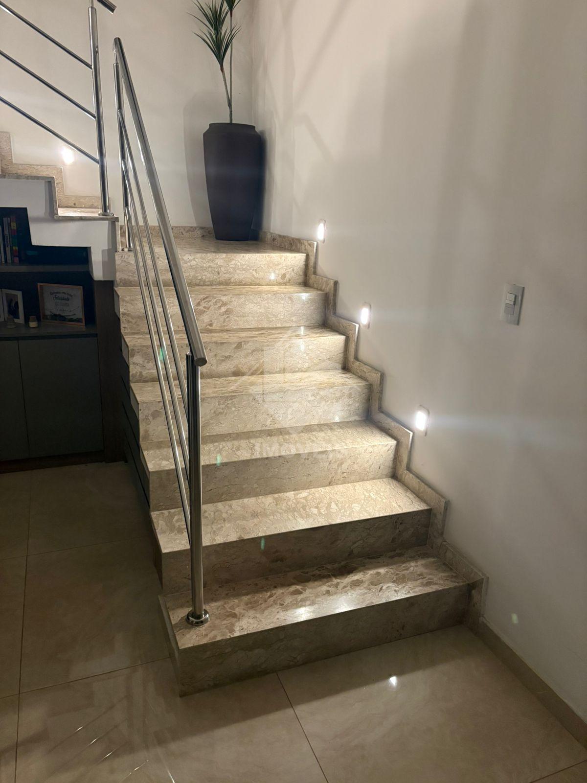 São 3 quartos, sendo duas suítes, uma no primeiro andar e uma no segundo, sala, cozinha, banheiro social, cozinha planejada, escritório planejado, lavanderia planejada e garagem para 3 carros e motos, sendo dois carros independentes.