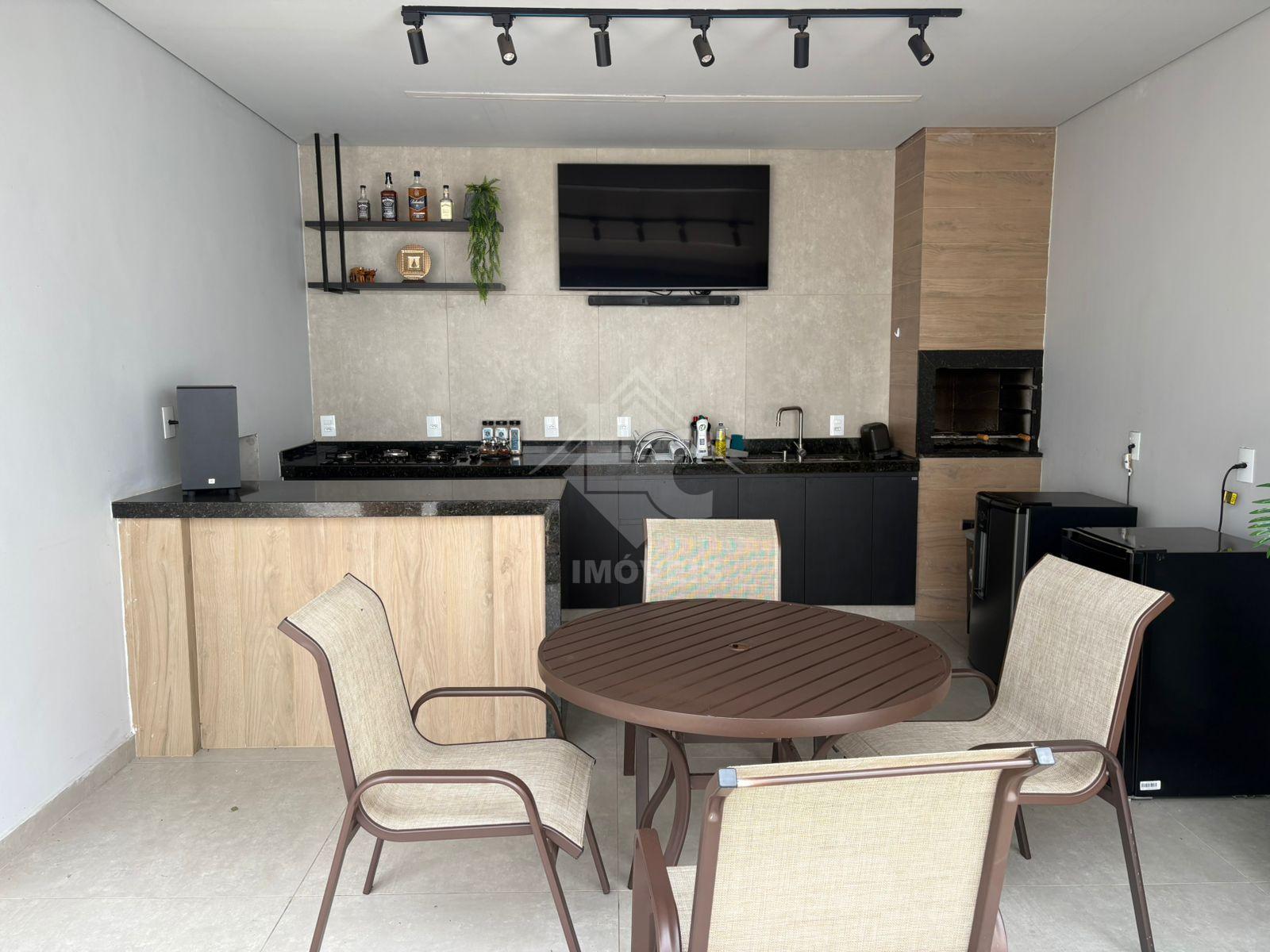 Área gourmet com pia, churrasqueira, fogão cooktop, banheiro e móveis planejados
